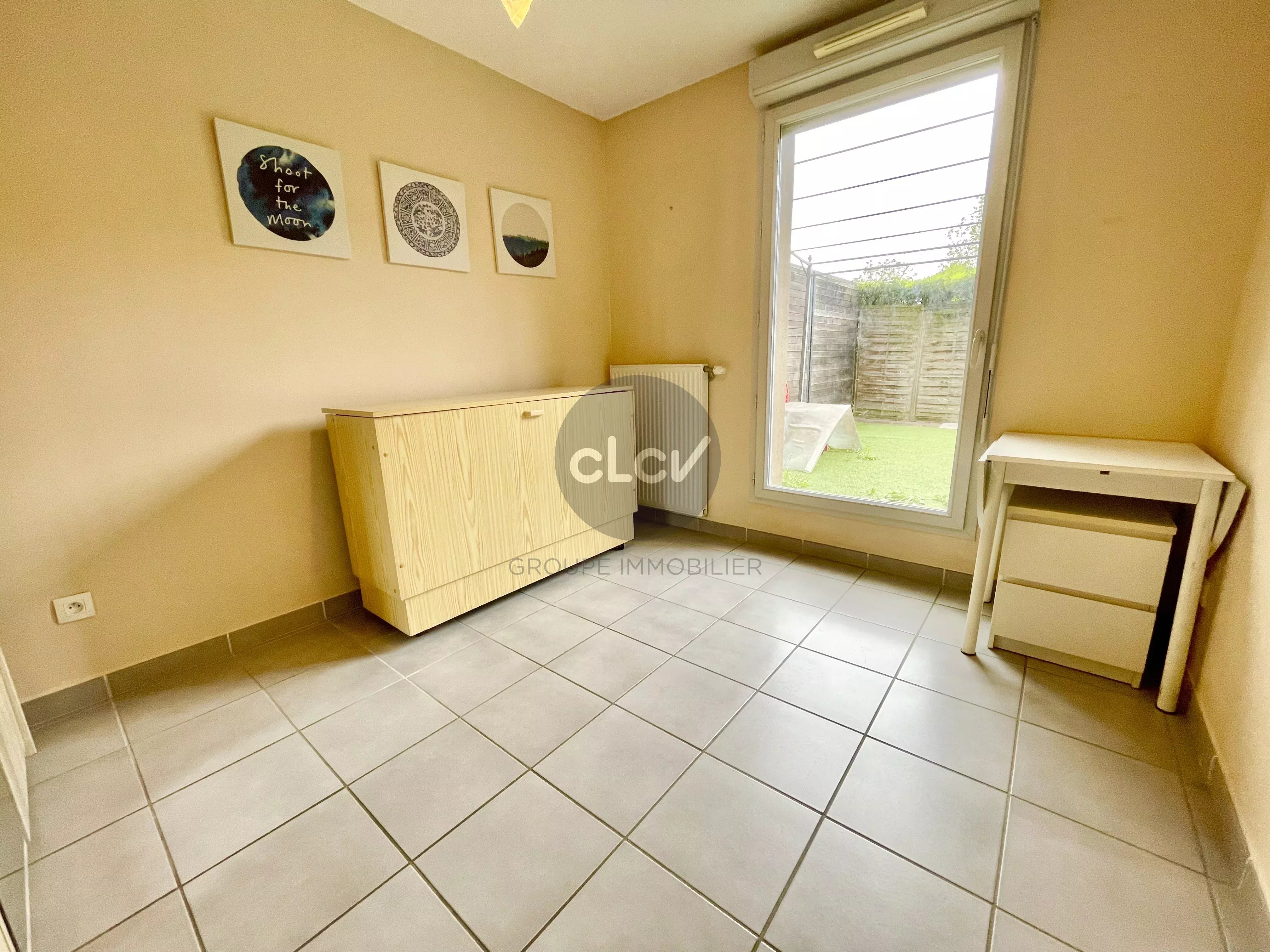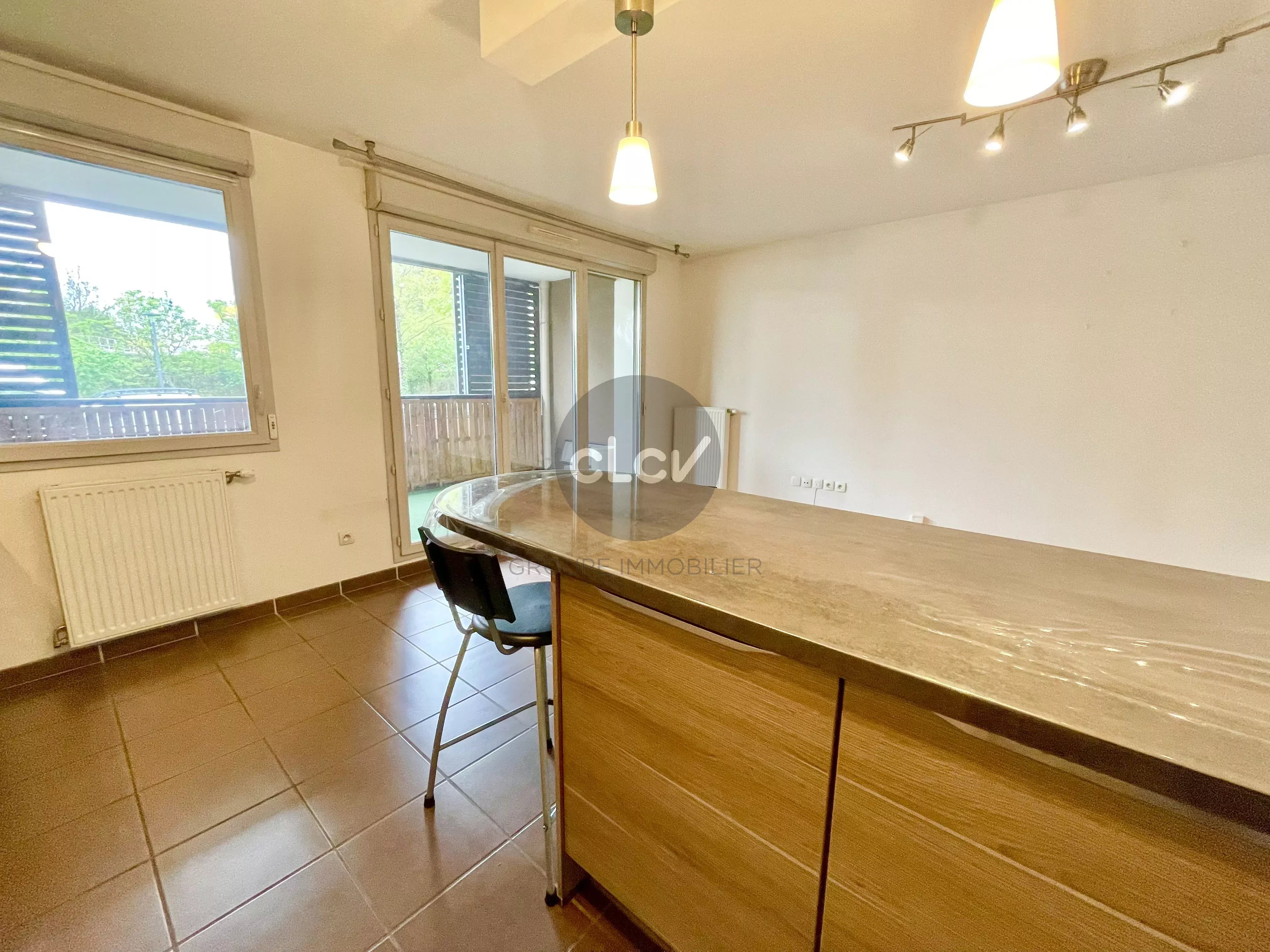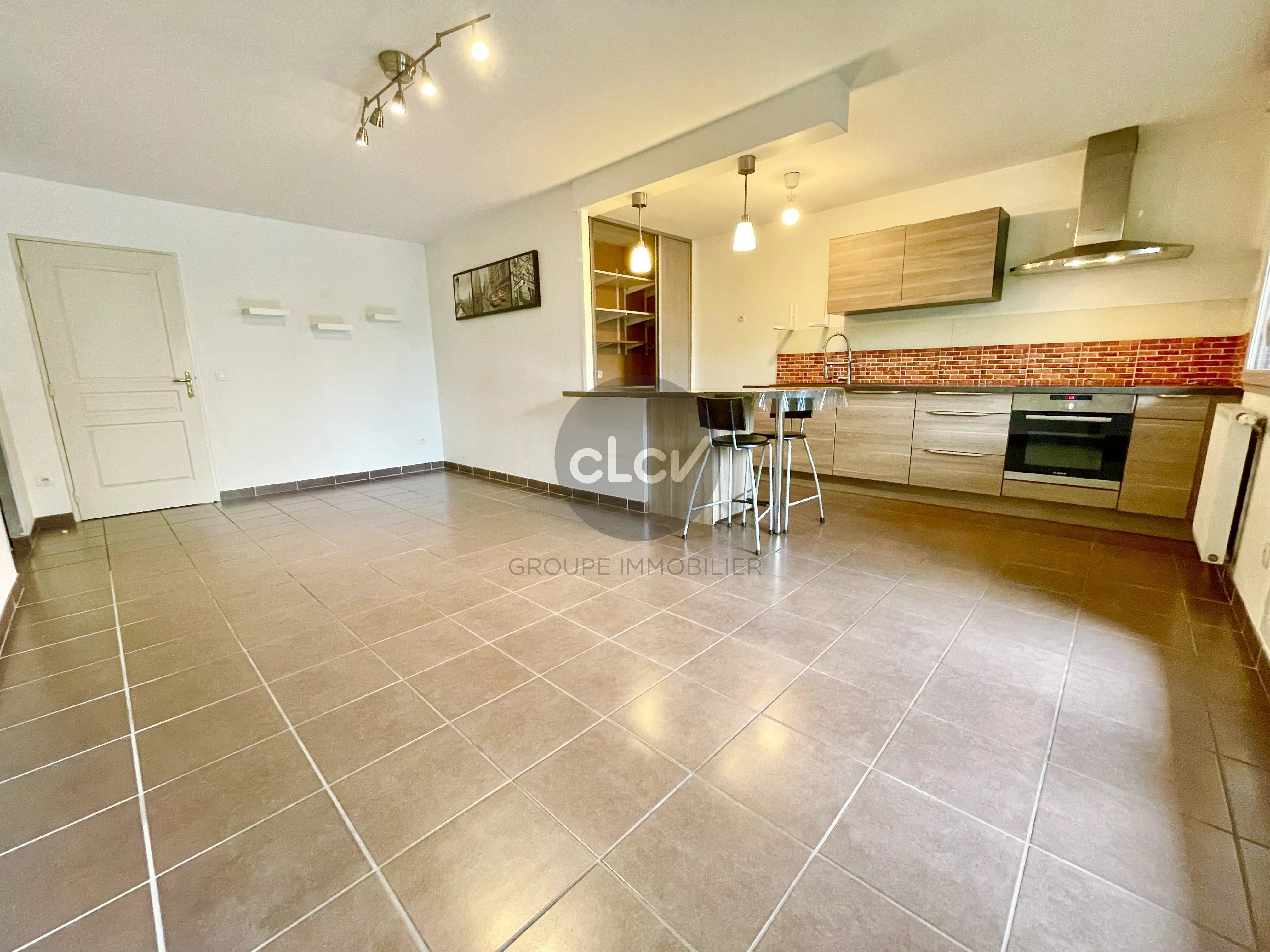 Séjour avec Cuisine US Meublée et Equipée ouvert sur Terrasse sans vis à vis, 3 Chambres ouvertes sur Jardin privatif de 50 m² au calme, Salle de Bains avec Baignoire, Toilettes.