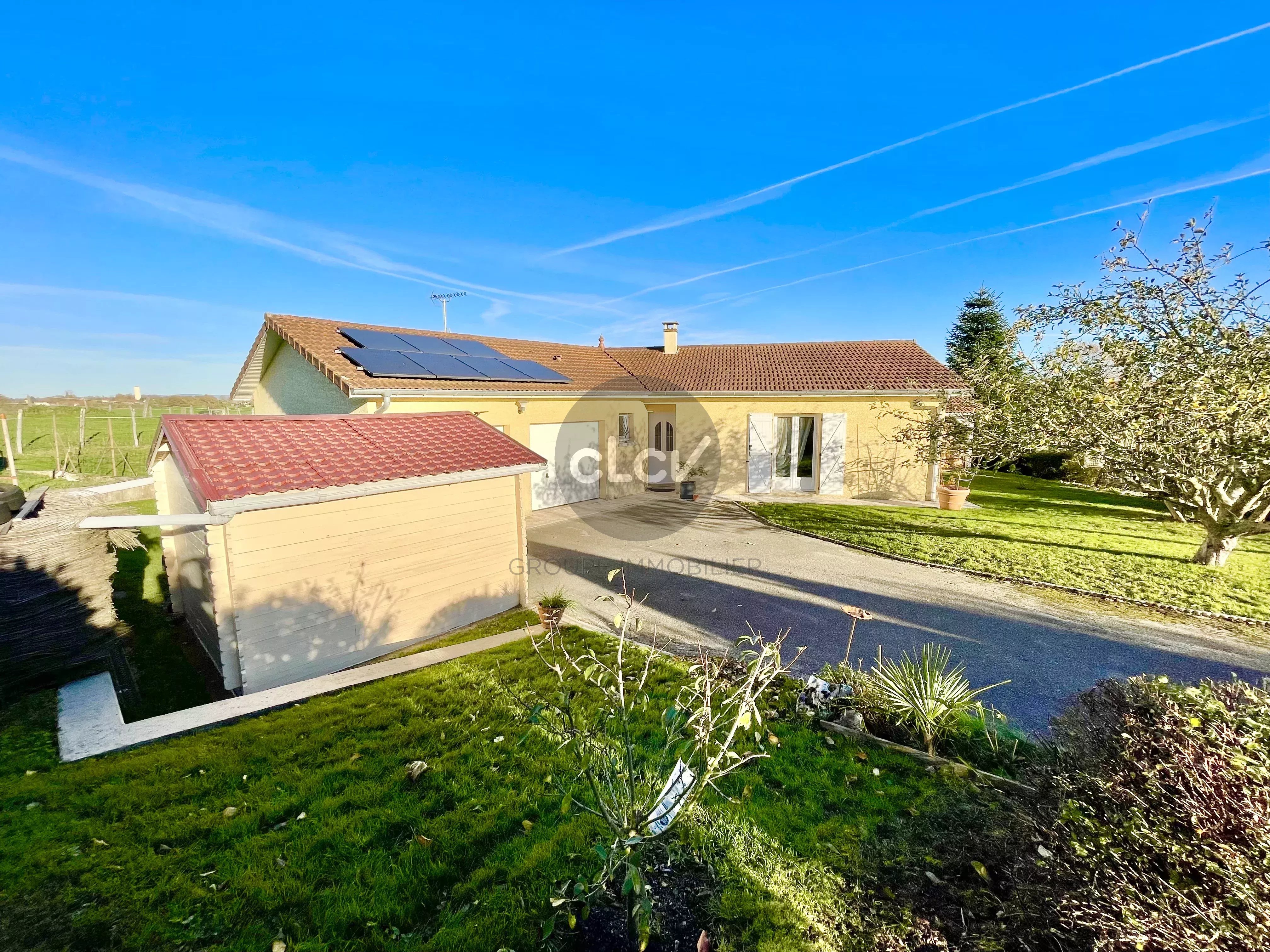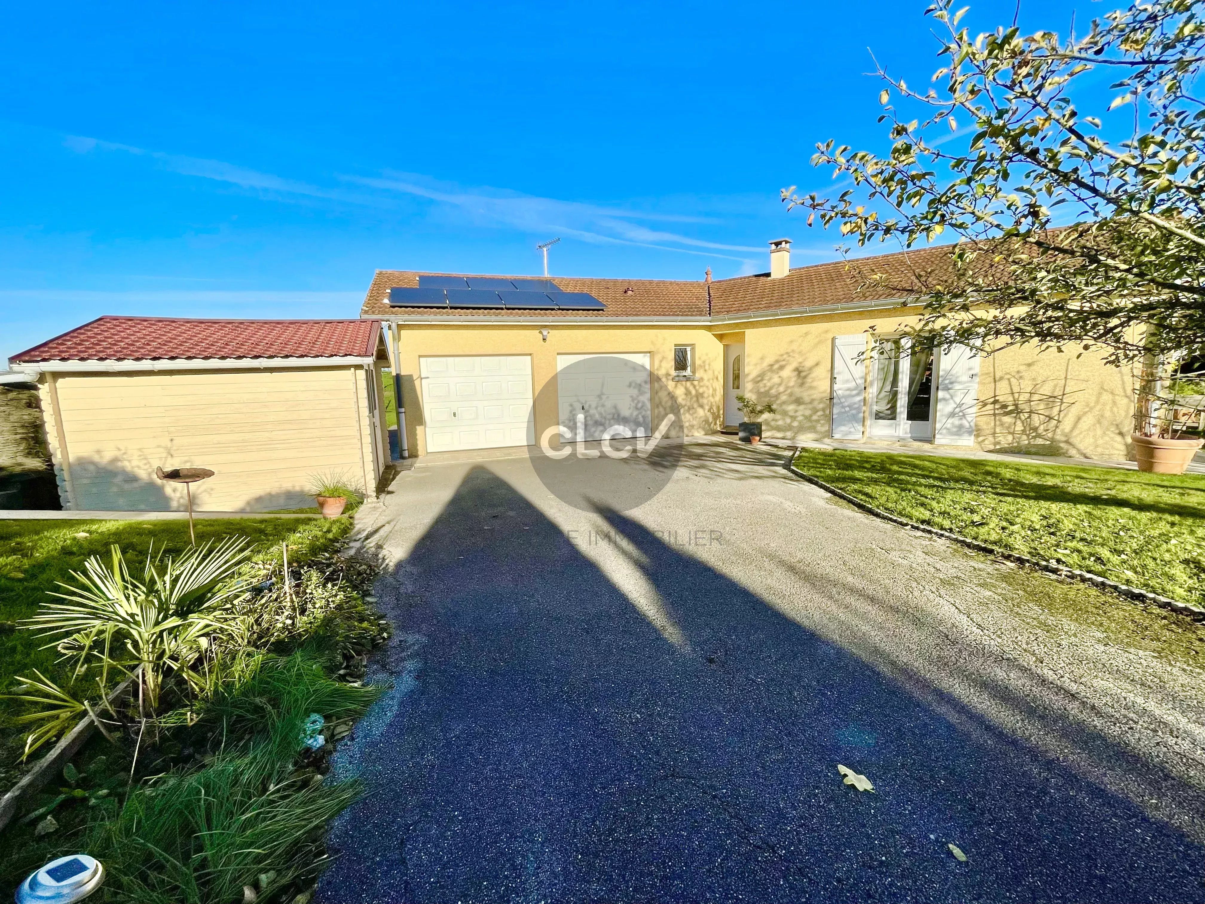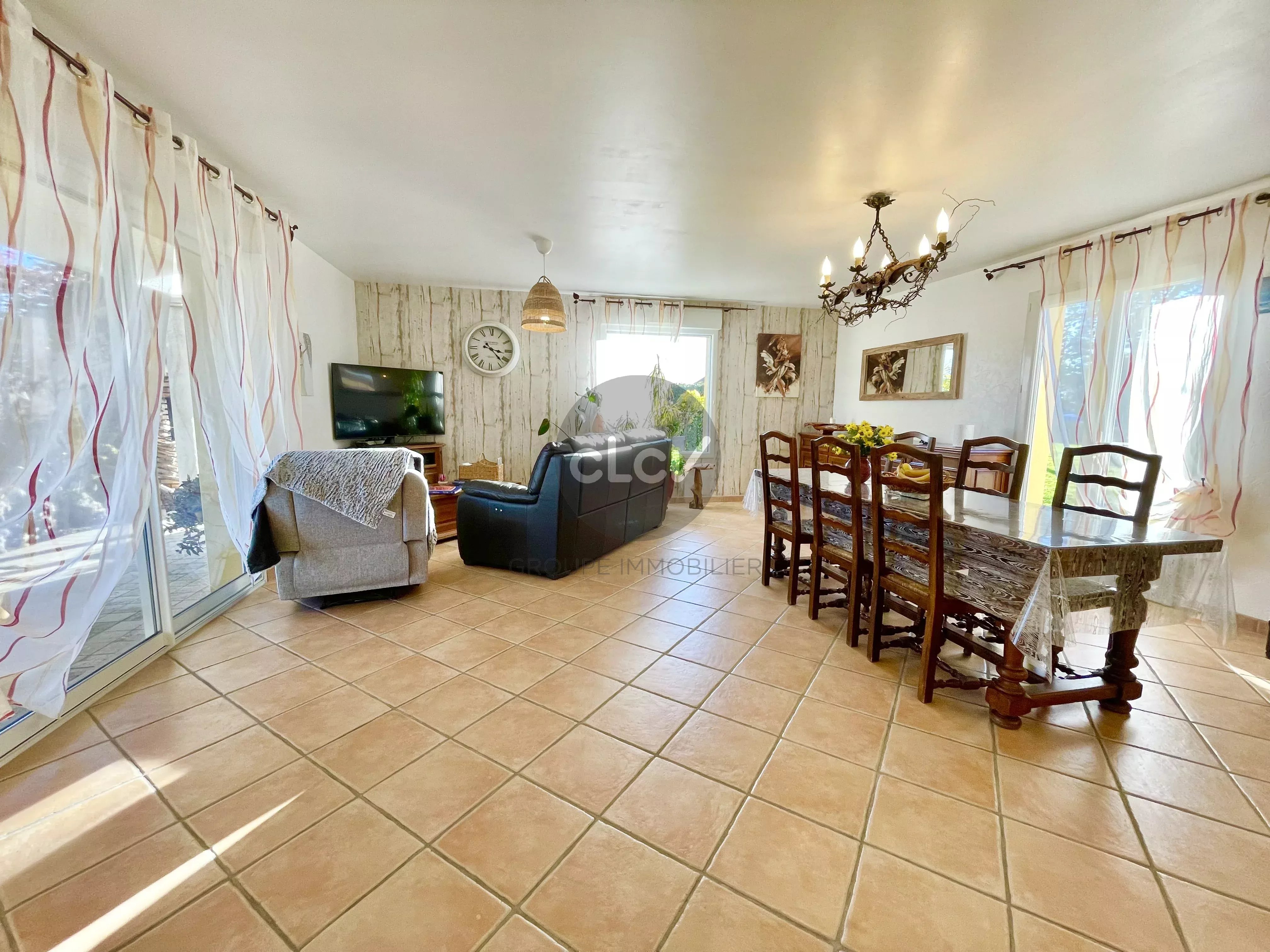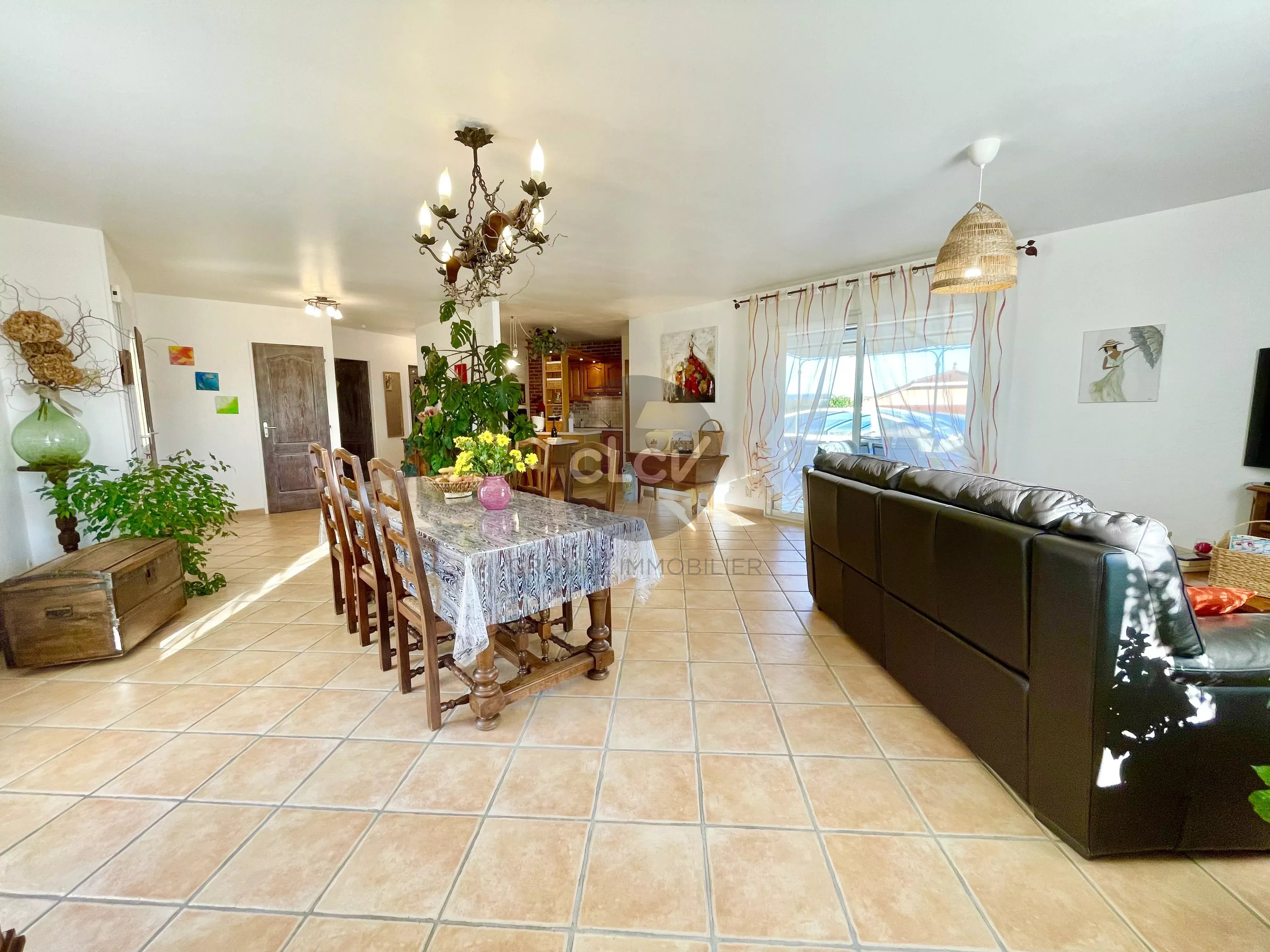 Grand Séjour/Cuisine US meublée équipée de 55 m² ouverts sur une Terrasse couverte, un espace nuit avec 3 Chambres, une Salle de Bains avec Baignoire et Douche balnéo, 2 Toilettes, une Buanderie, une Cave, et un accès intérieur au Garage double de 42 m² carrelé avec portes motorisées.