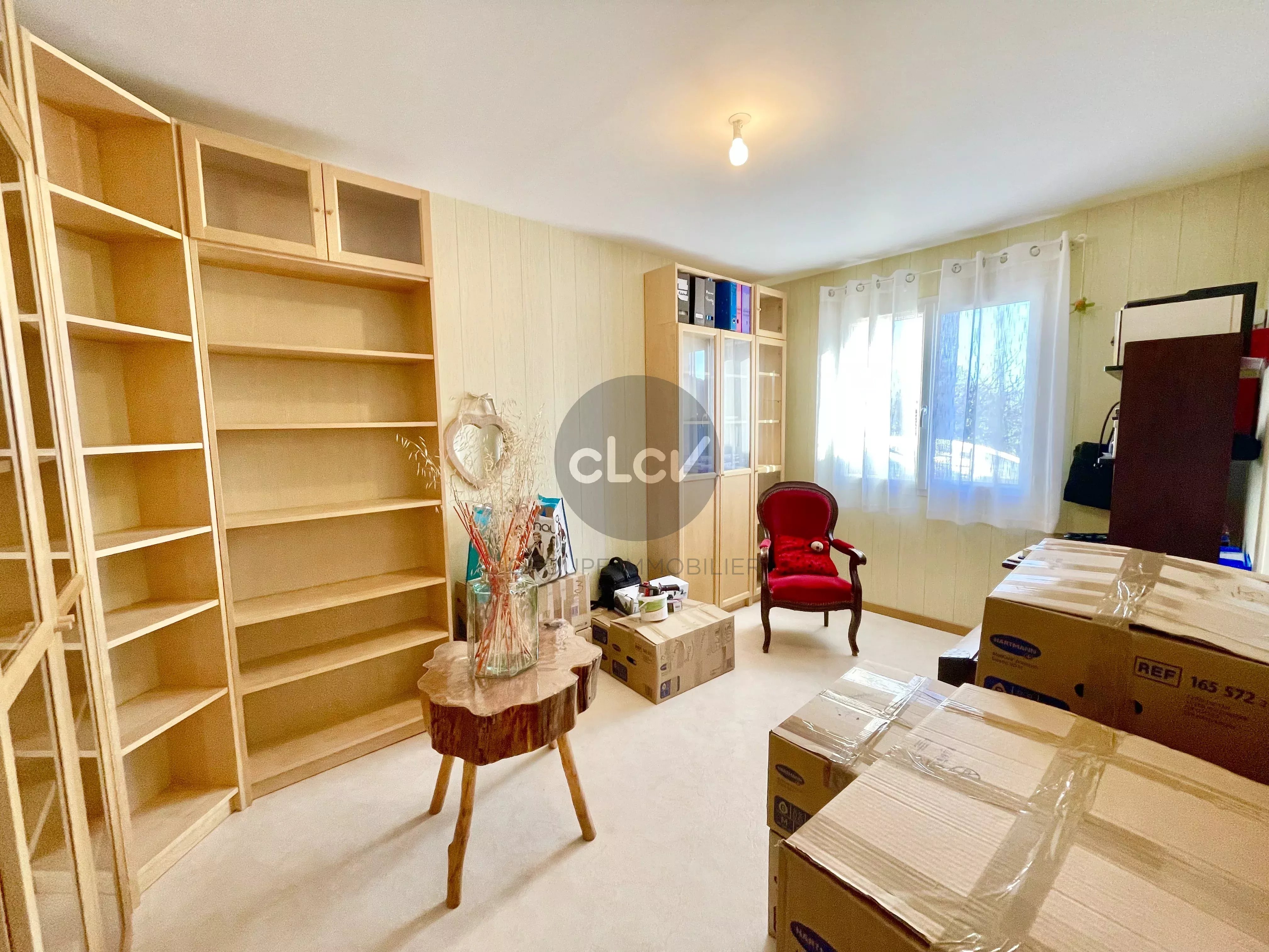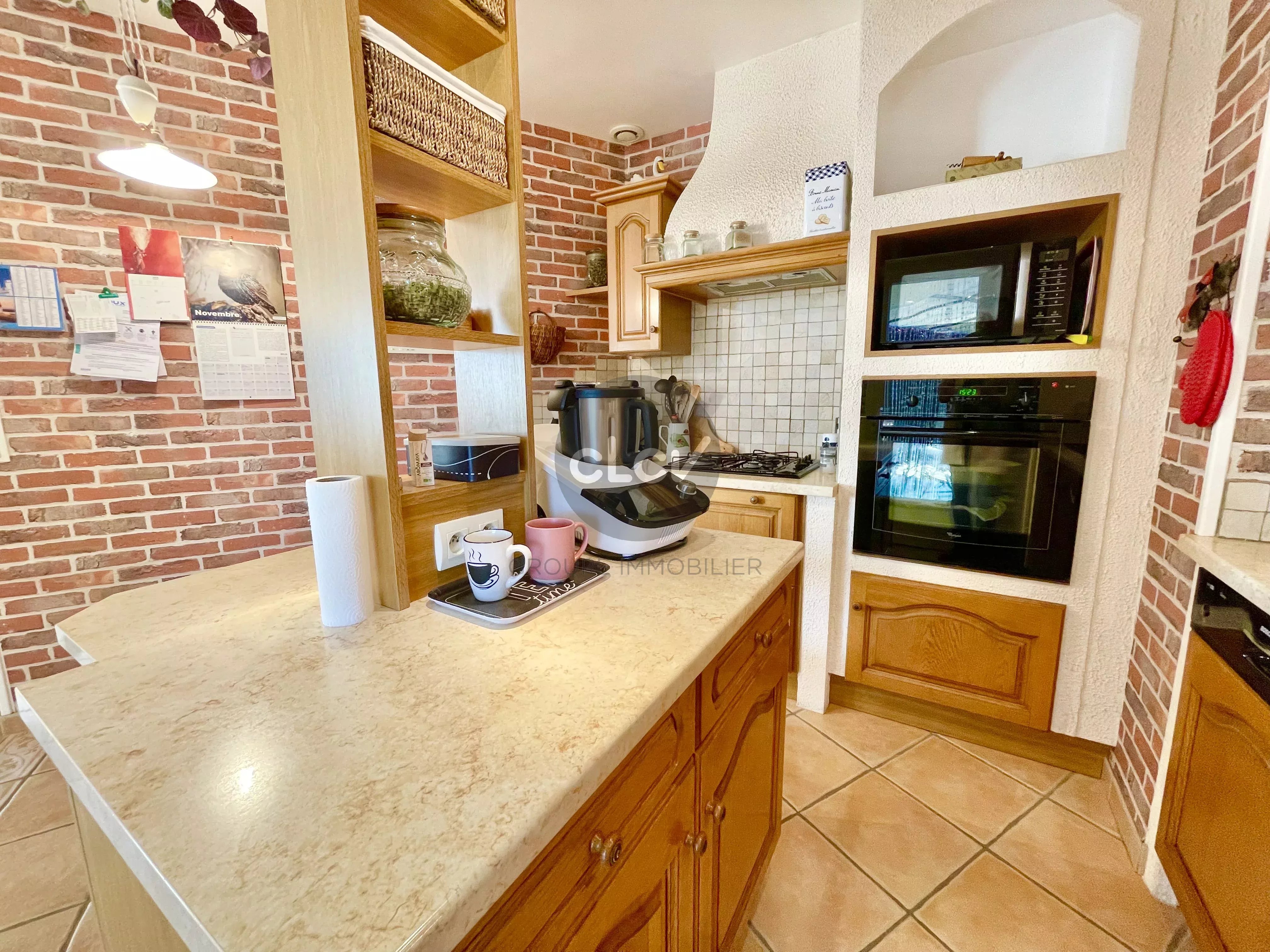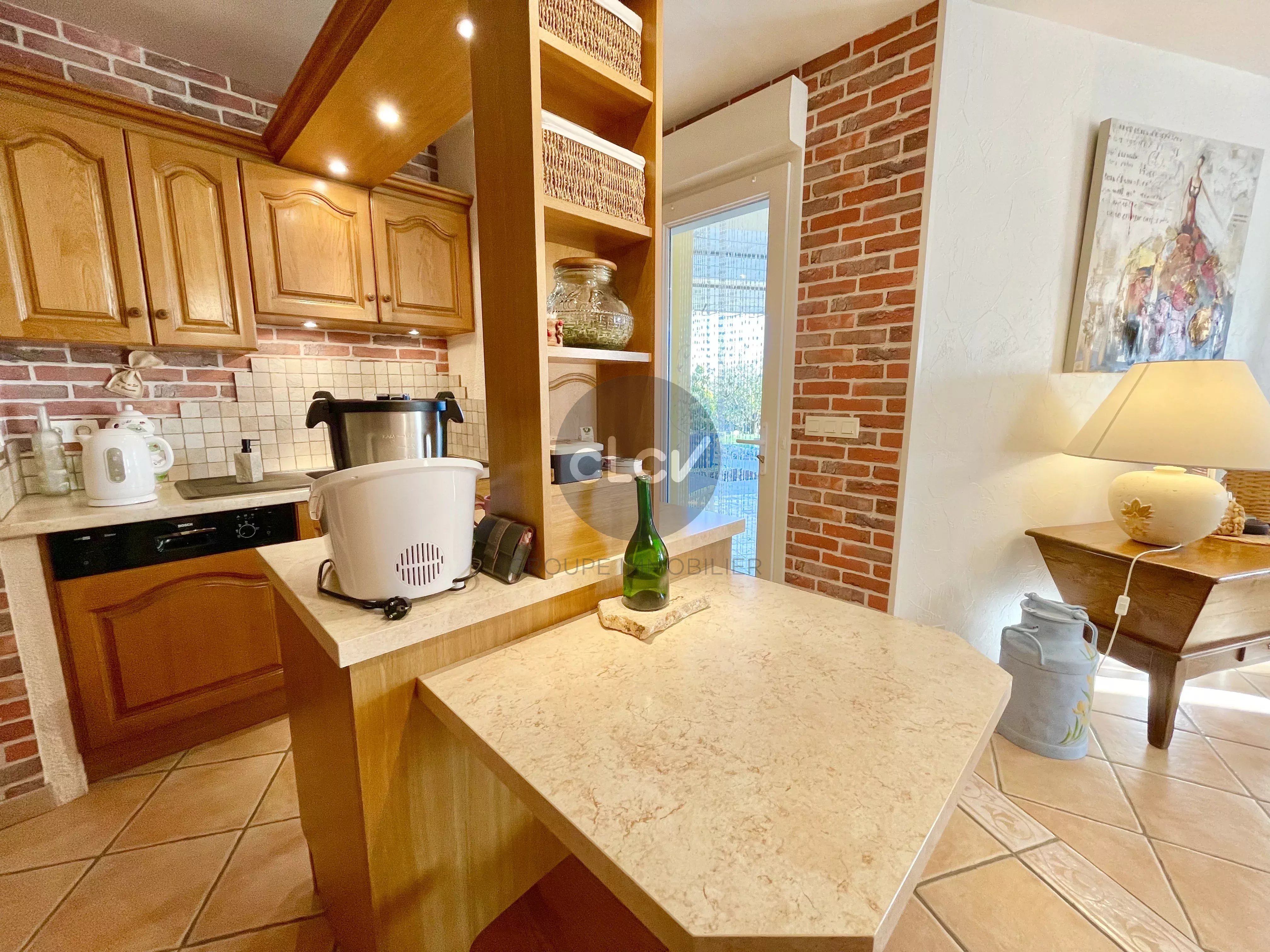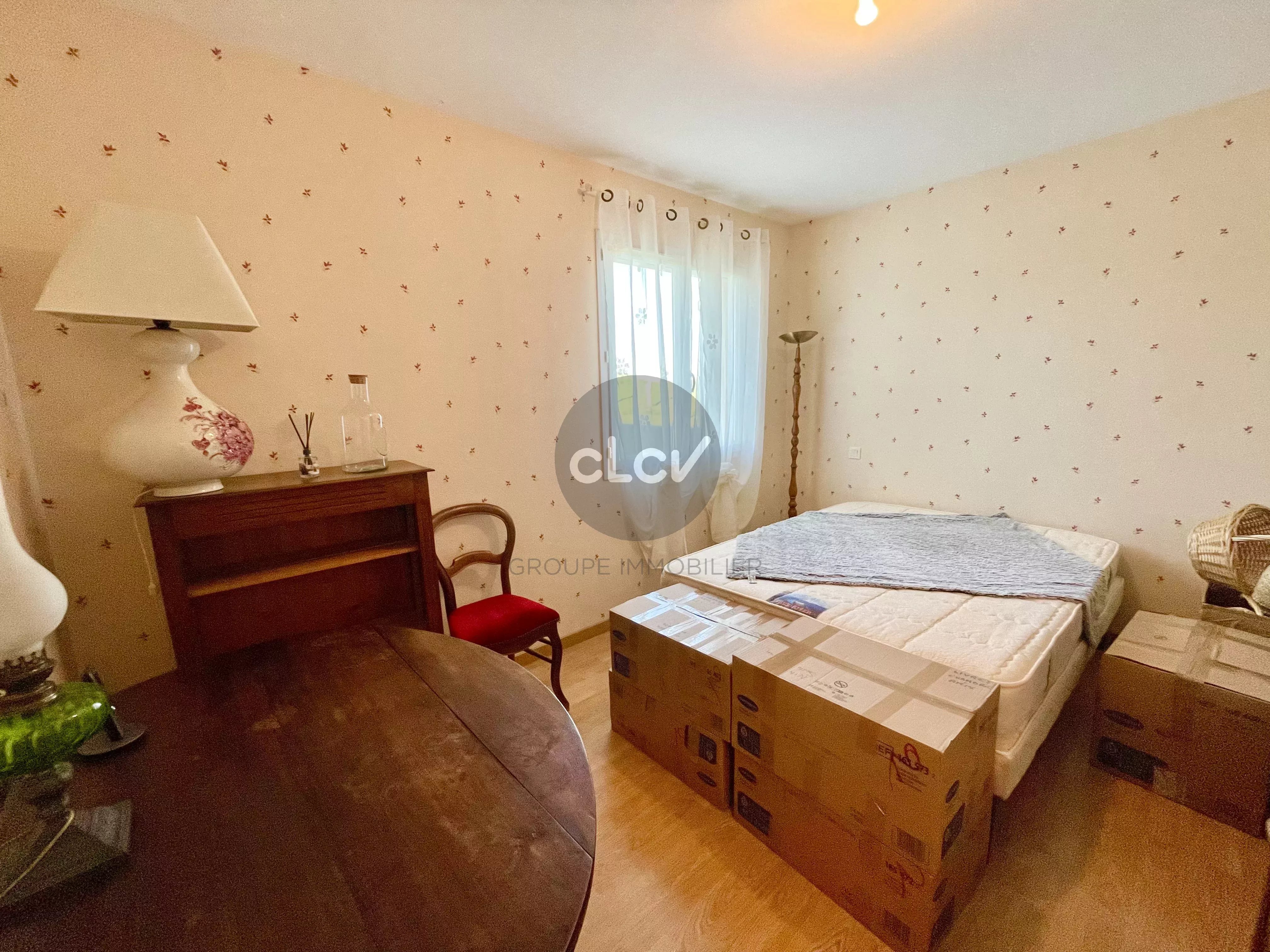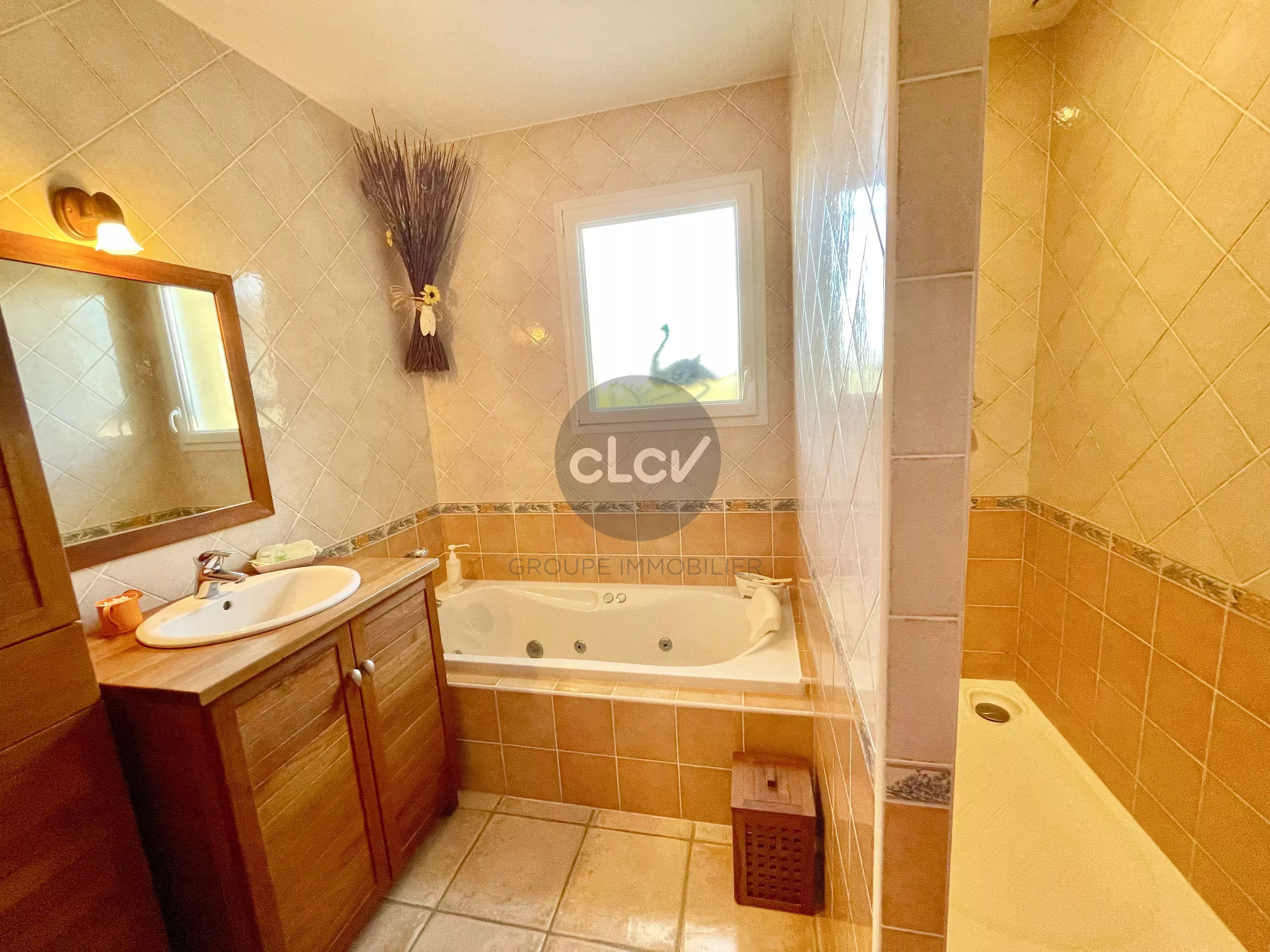 Grand Séjour/Cuisine US meublée équipée de 55 m² ouverts sur une Terrasse couverte, un espace nuit avec 3 Chambres, une Salle de Bains avec Baignoire et Douche balnéo, 2 Toilettes, une Buanderie, une Cave, et un accès intérieur au Garage double de 42 m² carrelé avec portes motorisées.