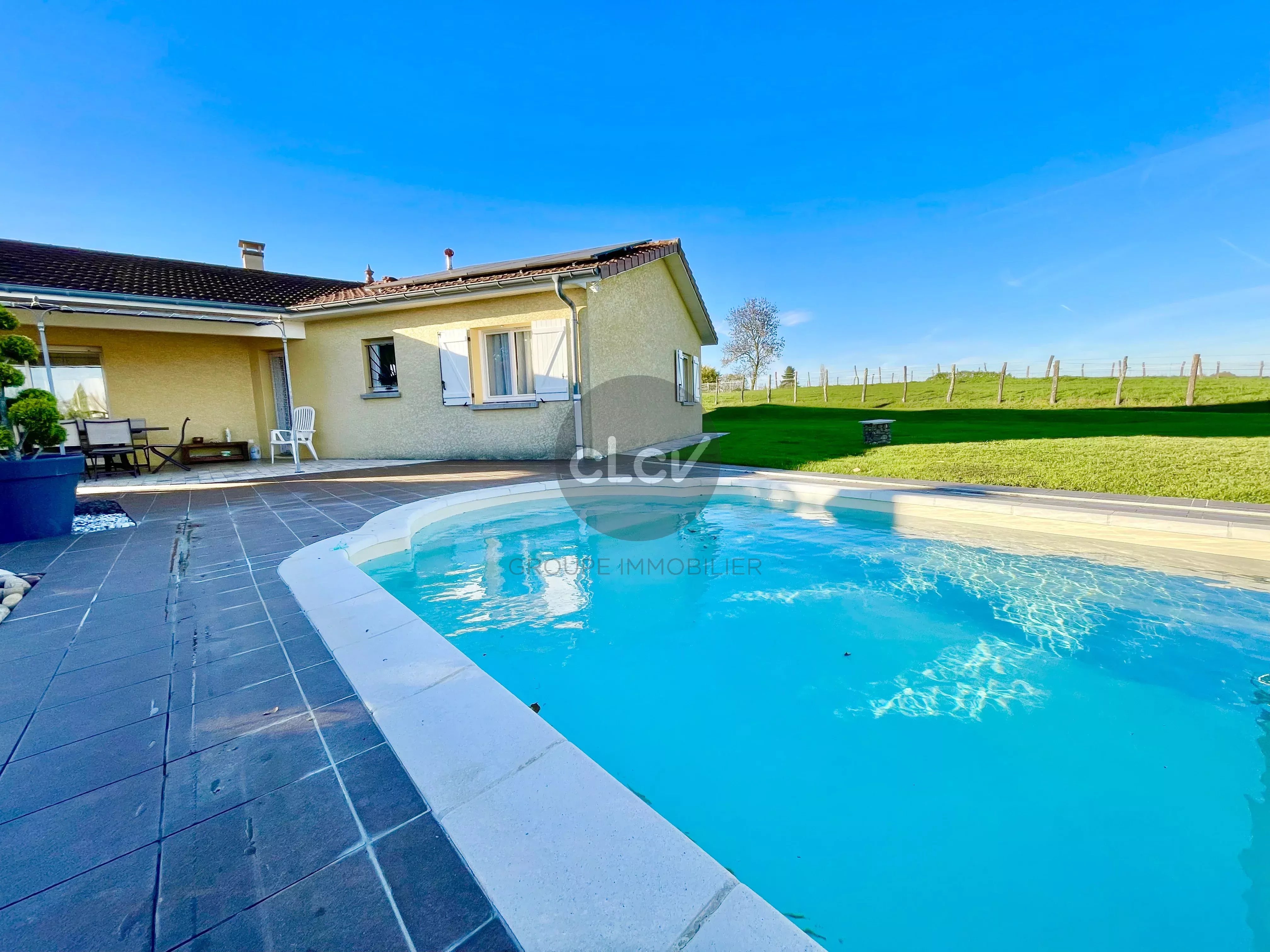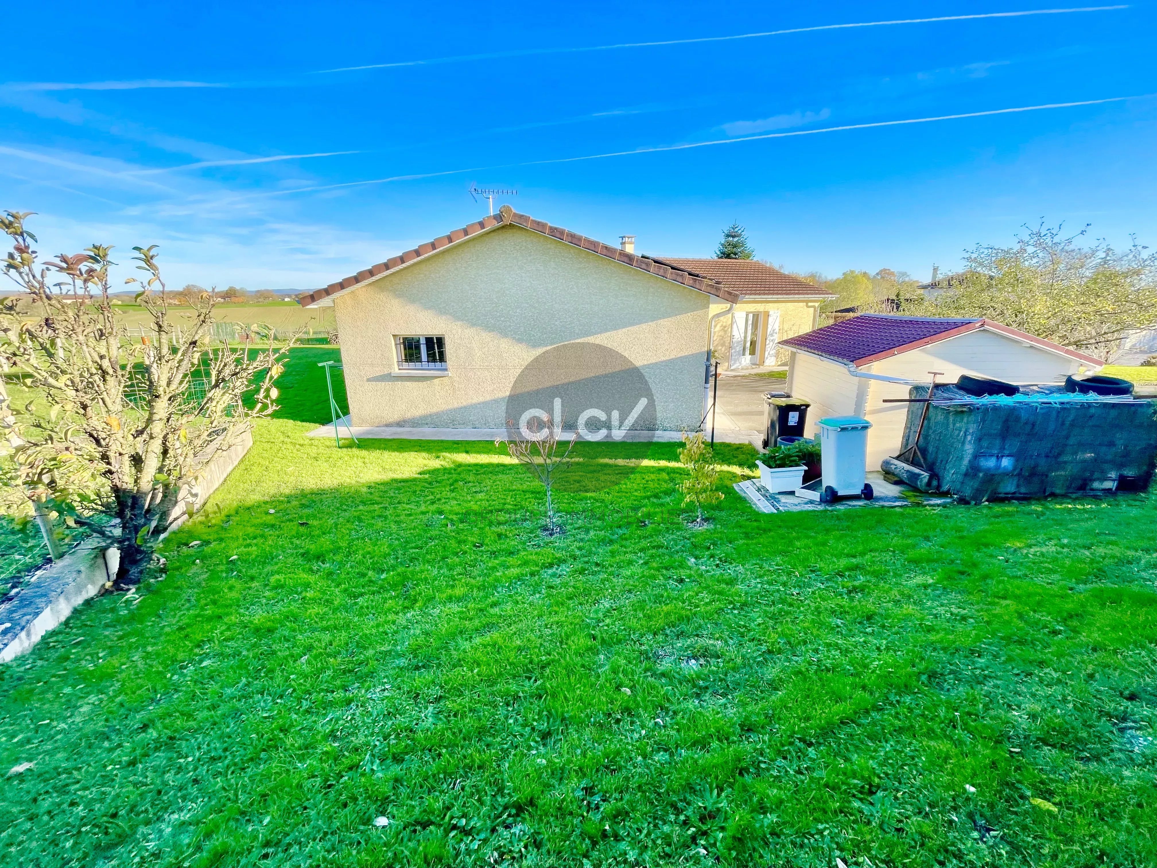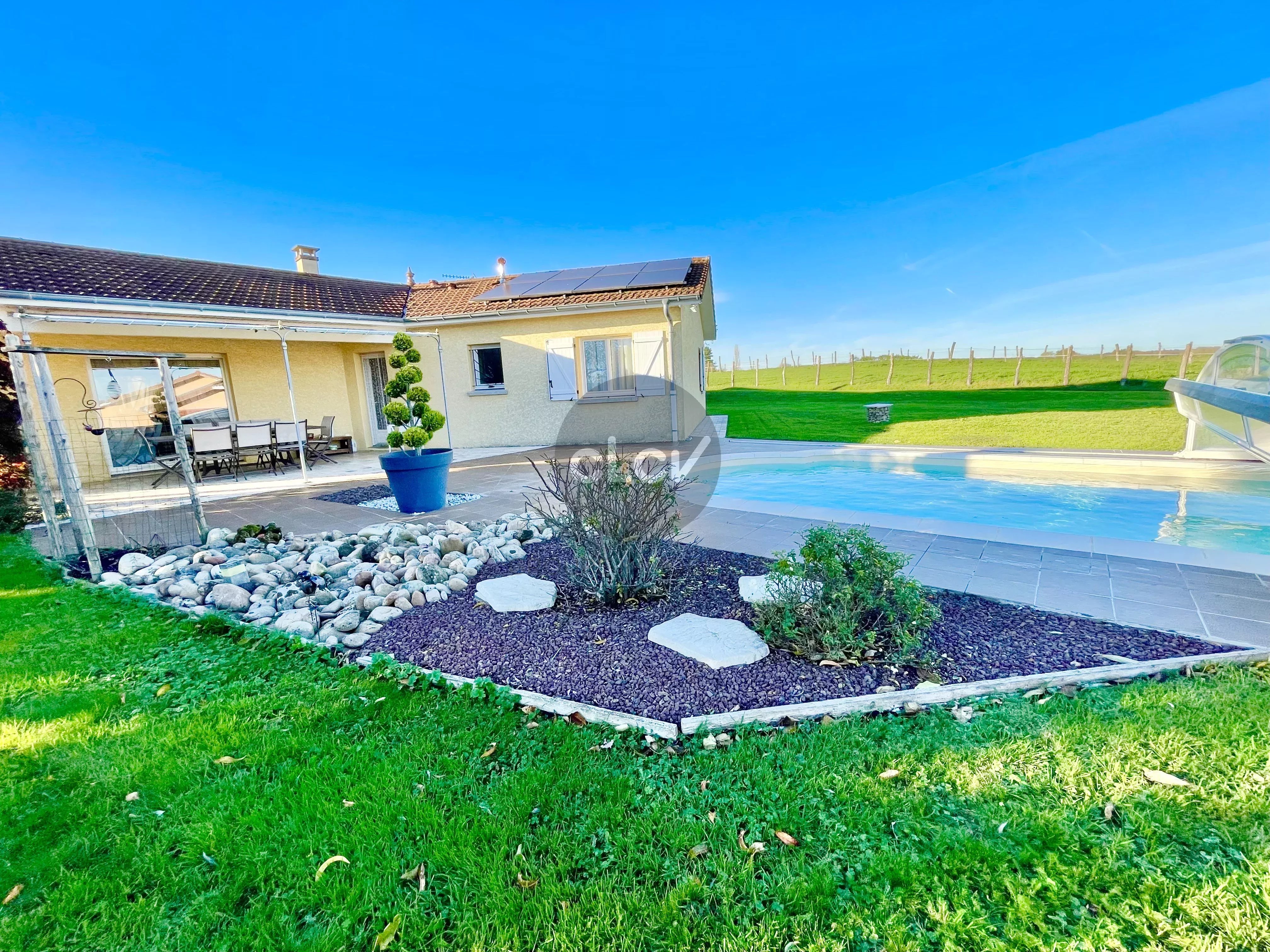 A saisir, belle Maison récente de 115 m² de plain-pied en parfait état + Garage double de 42 m² + Piscine couverte, sur une parcelle arborée de 1 513 m², au calme absolu sans vis à vis à quelques minutes du centre de Foissiat, de Montrevel en Bresse, et des autoroutes A38 et A46.