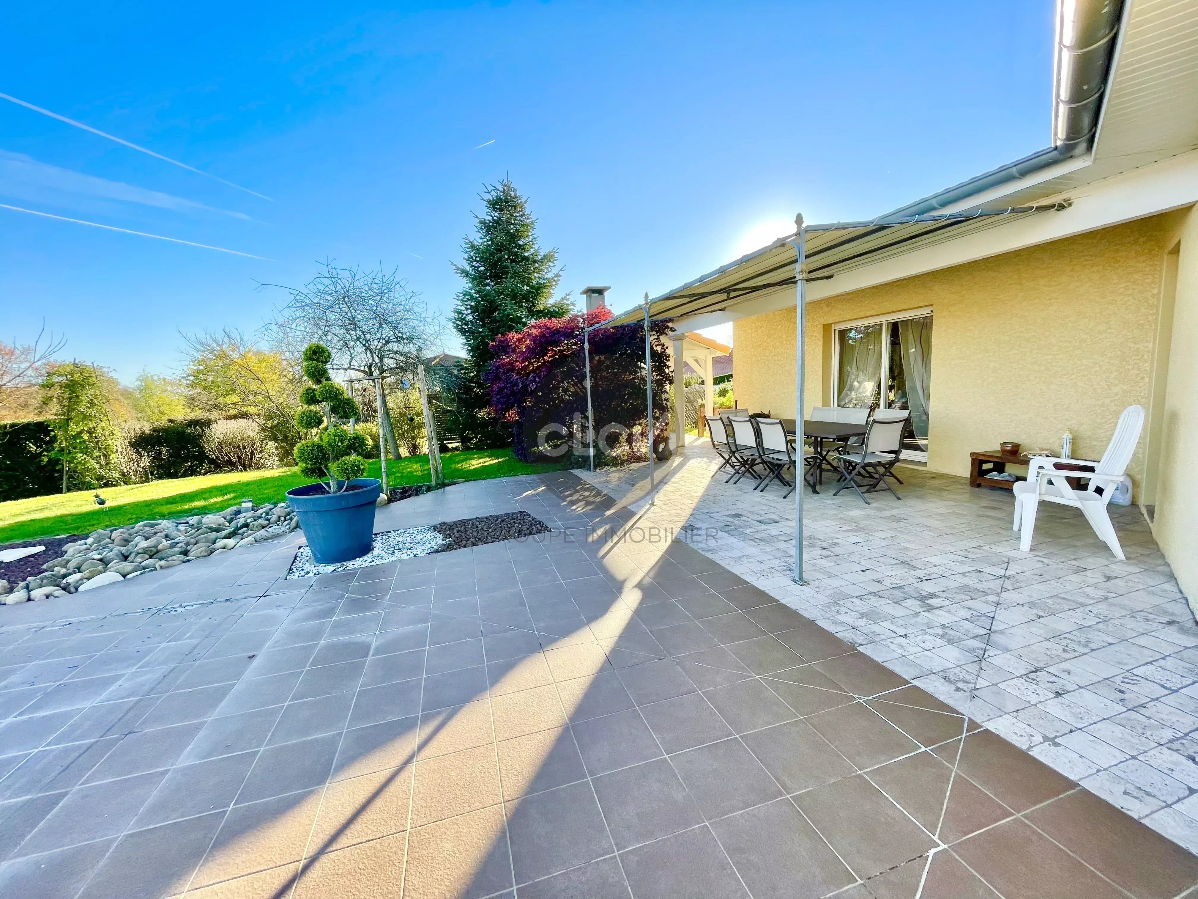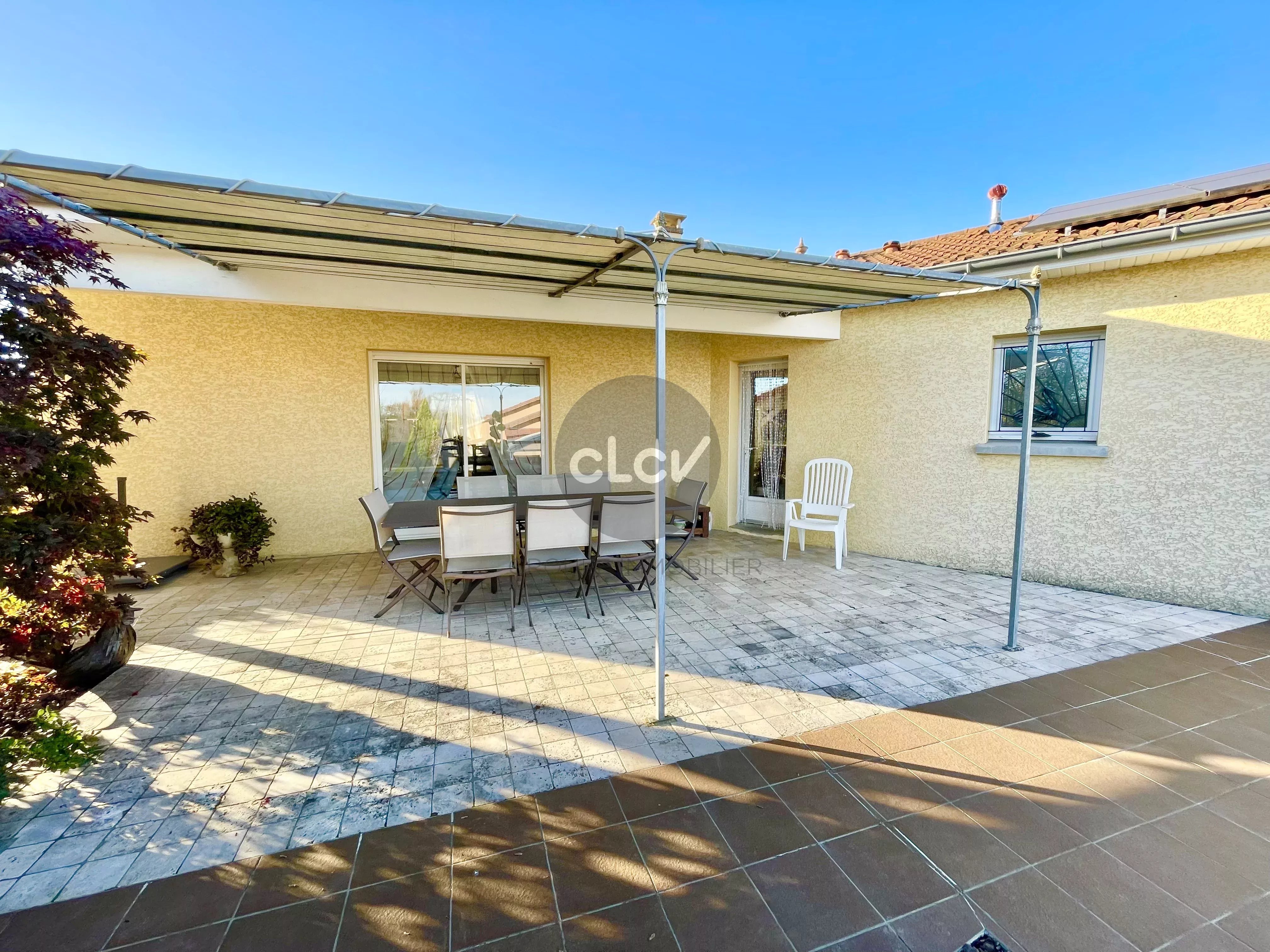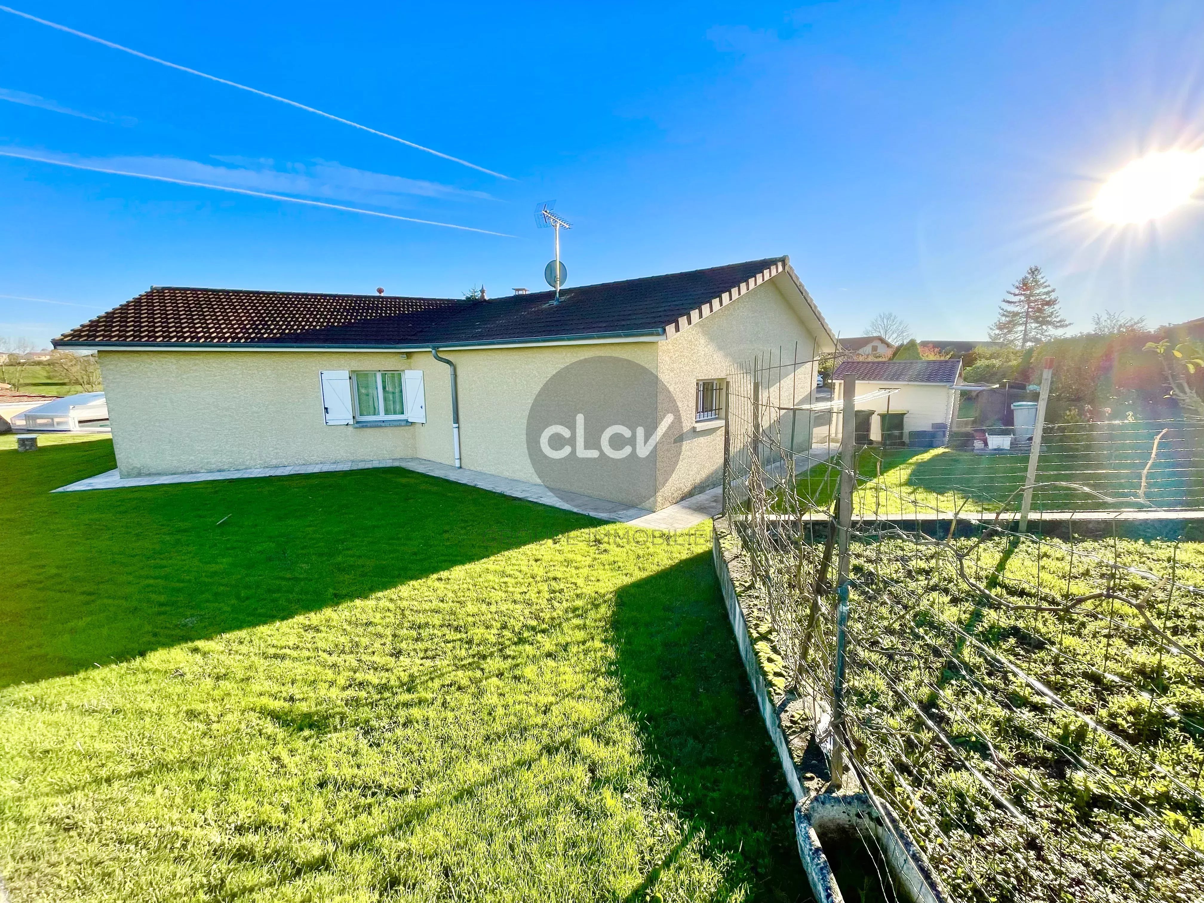 A saisir, belle Maison récente de 115 m² de plain-pied en parfait état + Garage double de 42 m² + Piscine couverte, sur une parcelle arborée de 1 513 m², au calme absolu sans vis à vis à quelques minutes du centre de Foissiat, de Montrevel en Bresse, et des autoroutes A38 et A46.